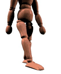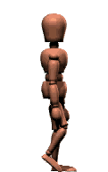 プレッシャー・ウォークでもそうでしたが、腕の動きも重要です。 脚の動きに合わせて、軽く腕を振るようにしてください。手と脚が同時に出たりしないよう、気をつけましょう。 特に、プロファイル・ウォークは、プレッシャー・ウォークよりも腕の動きがはっきり見えるので、プレッシャー・ウォーク以上に腕の使い方に気を配ることが必要です。 上のアニメーションでは、妙に腰や胴体がどっしりと落ち着いていますが、実際には重心の移動によって胴体が多少左右に振れます。 ・・・あとは数をこなしていきましょう。プロファイル・ウォークは結構しんどいんで慣れないうちは大変ですが、なるだけスムーズに歩けるようにしましょう。 −− プレッシャー・ウォークでもやったように、さまざまなイメージで歩いてみましょう。 自分はいったいどういう人物なのか、自分が今いるのはどこなのか・・・。天気や道が悪いとき、自分がしんどいときや楽しいとき、そういういろんな状況を思い出して歩いてください。 歩きながら、まわりの風景やら何か落ちていないかとか見回したりもしてください。 |